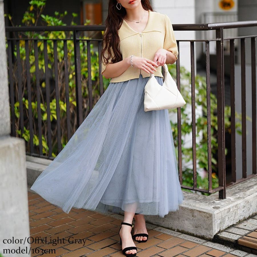 コンパクトなニットが全体にメリハリをプラスし、ファスナーとリブニットが縦ラインを強調。ゆったりとしたフレアスリーブは二の腕をカバーし、ウエスト部分の高めの切り替え位置で脚長効果に。ふわっと広がるエアリーなスカートは風を纏うような華やかさで下半身を体型カバーします。