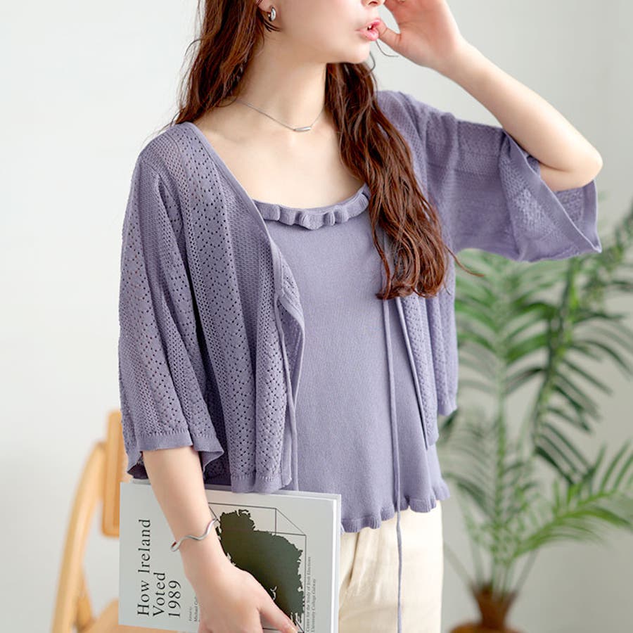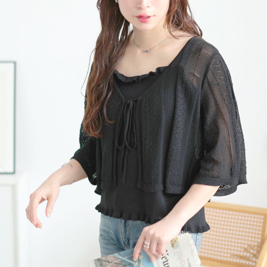涼しげな透かし編みボレロとフリルキャミソールの2点セットです。