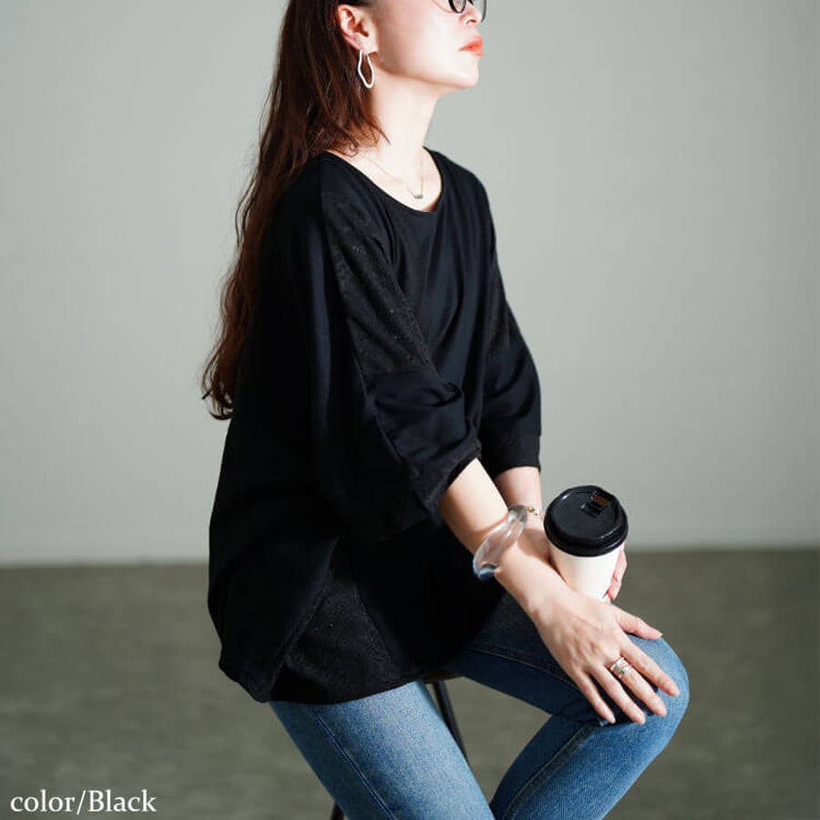 無地部分はコットン混の柔らかな肌触りが心地良いカットソー生地、レース部分は繊細な模様がさりげなくコーデにアクセントを添えるカットレース生地の、質感が違う異素材使いでこなれ見えするとっておきの一着です。