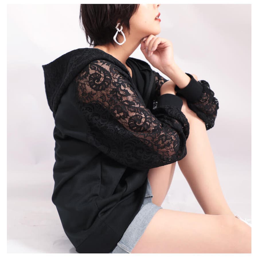 パーカーにレースをドッキングした他には無いデザイン。レースの袖は透け感がありトレンドライクな着こなしに。レースが上品で女性らしさをプラスしてくれます。