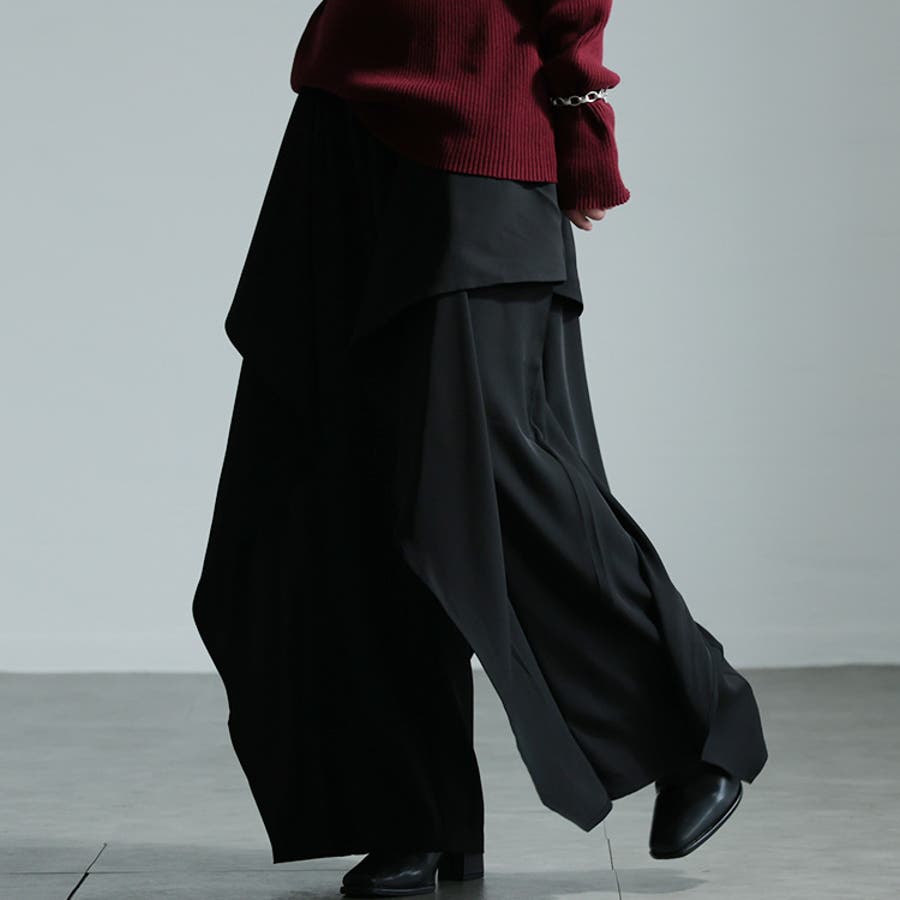 小さな滝が連なり流れているような大胆なフリルで品よく体型をカバー。幅広なパンツシルエットでハンサムなモードスタイルにもマッチします。