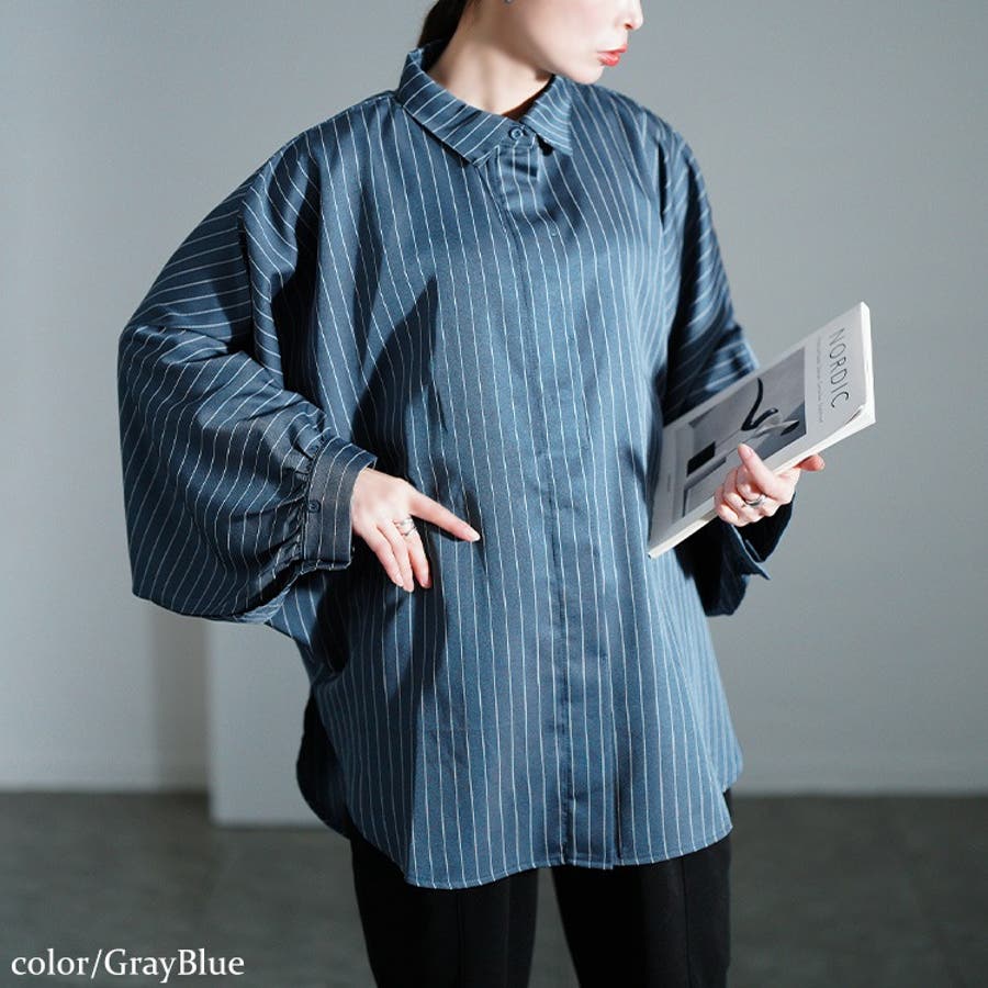 きちんと見えするシャツスタイルに、ストライプ柄が重なりスタイリッシュ感を加速させる一枚。ドルマンスリーブのゆったり感がトレンドを重ね、ラフな大人のスタイリングに仕上がります。ボタンが隠れる比翼仕立てで見た目もすっきり。羽織りとしても活躍する万能シャツです。