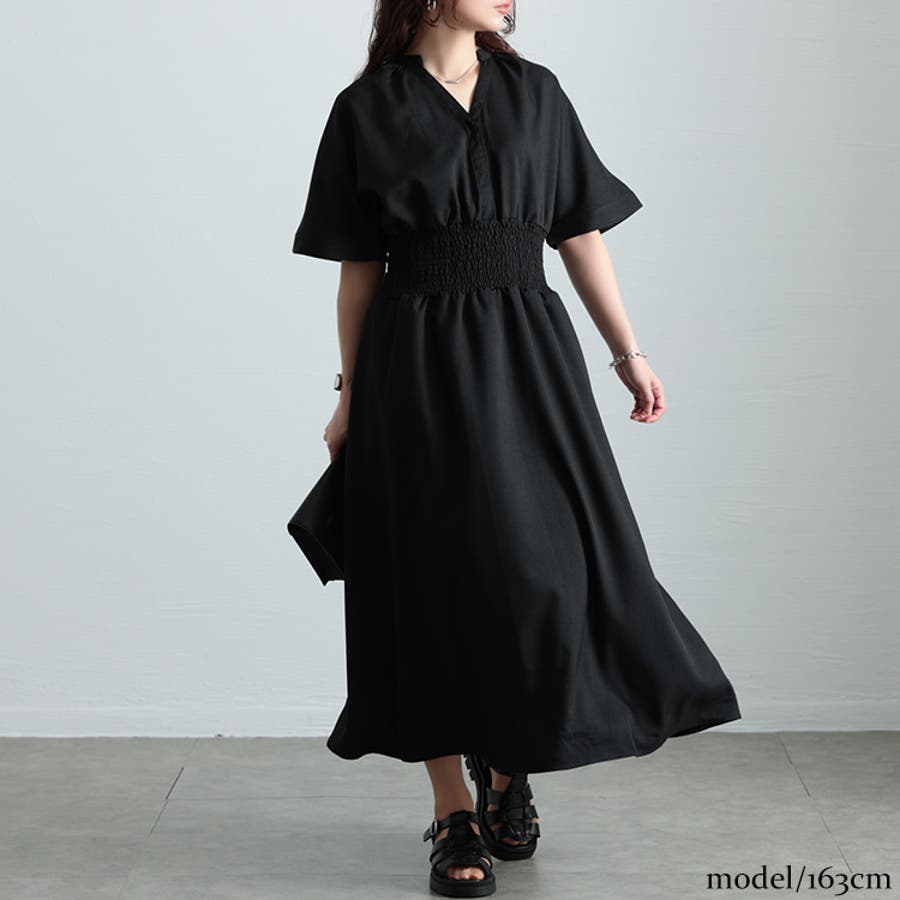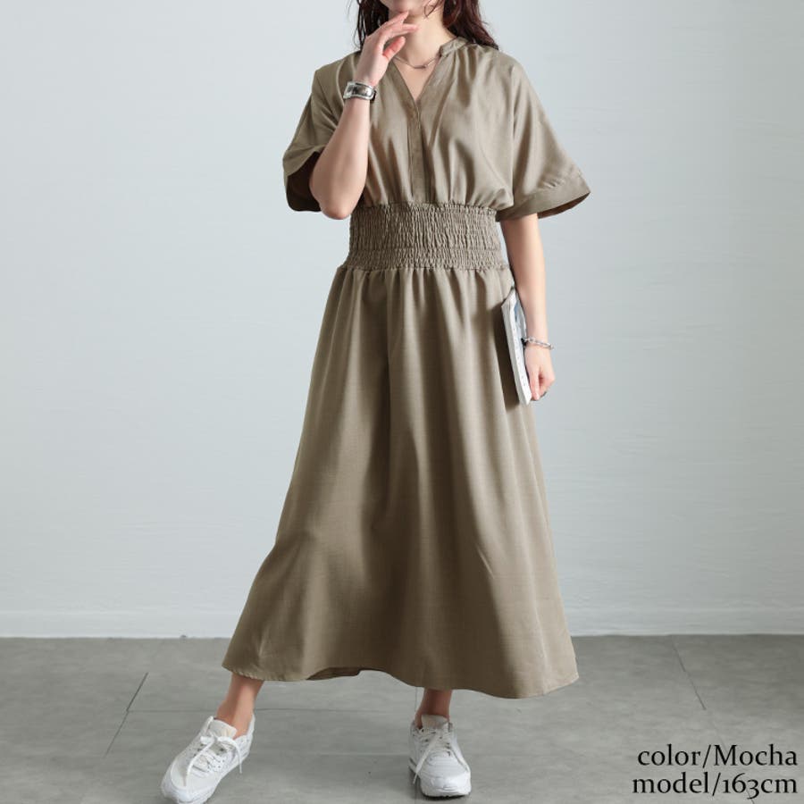 品の良さが醸し出す、大人のワンピース。ウエストに幅広のシャーリング切り替えがデザインされたワンピースは、ウエスト周りにメリハリを生み、キーネックのV字カットで大人っぽさが漂い、すっきりと見せ、着るだけでスタイルアップ効果のある品を感じさせる一枚。
