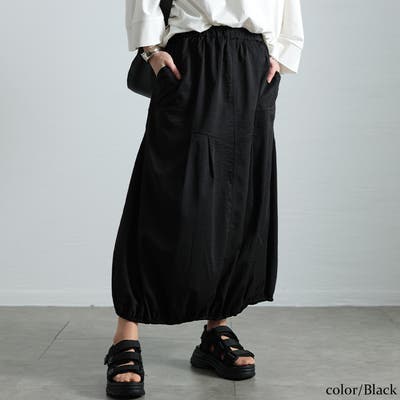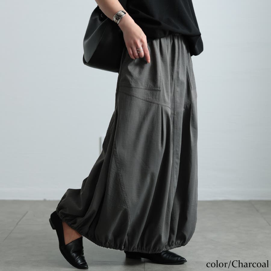 シンプルなスカートに、斜めの切り替えやタックを重ねることで、こなれ感漂うひとくせあるシルエットに。裾にギャザーゴムを仕込むことで、しっかりバルーンシルエット形作ります。両サイドに配された、大きなポケットが抜け感をプラスし、カジュアルな印象に。