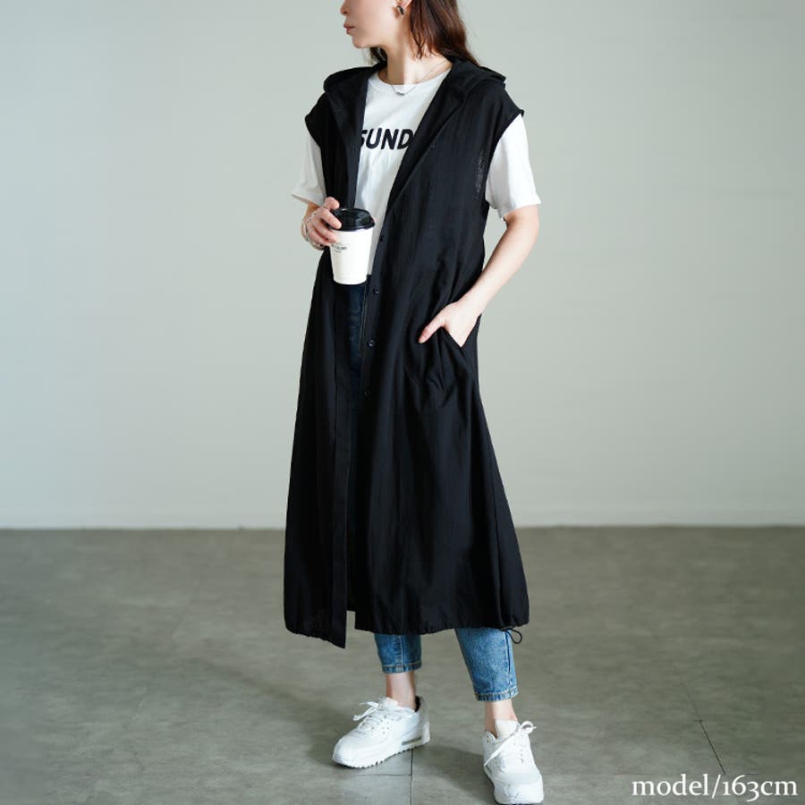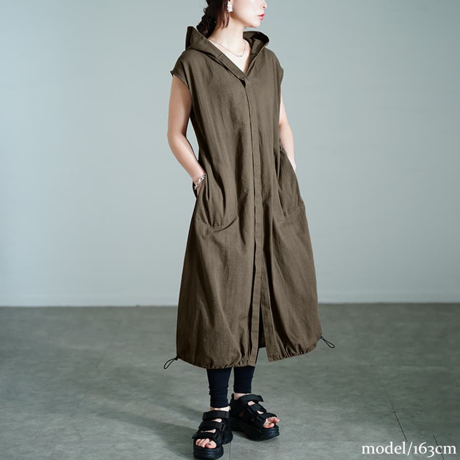 ノースリーブのシャツワンピースにフードを重ねたワンピースは、ジレとしても、ワンピースとしても活躍する万能アイテム。シンプルなデザインだから、コーデを選ばずプラスしやすいのも嬉しいポイント。裾のドロストを絞れば、バルーンシルエットでふんわり女性らしい印象を演出します。