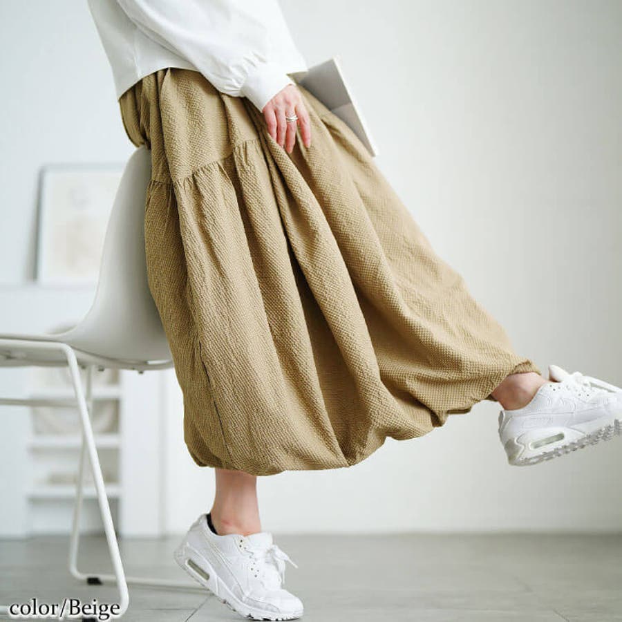 たっぷりギャザーを寄せたボリュームシルエットで、気になるぼっこりお腹・脚のライン&ヒップをふわりとカバーしてくれます♪