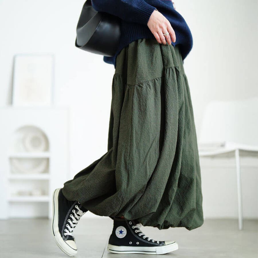 切り替えでヒップ周りのボリュームを抑えスッキリとしたバルーンシルエットを作り出し、どんなトップスとも相性抜群◎