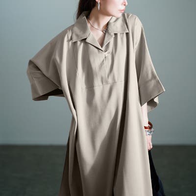 BIGシルエットのトレンド感のあるシルエットで、こなれ感を演出するシャツチュニック。オープンカラーでお顔周りを開放的にすっきりとさせ、ゆったりとラフながらもシャツデザインでキリッとした大人っぽさを演出する一枚。