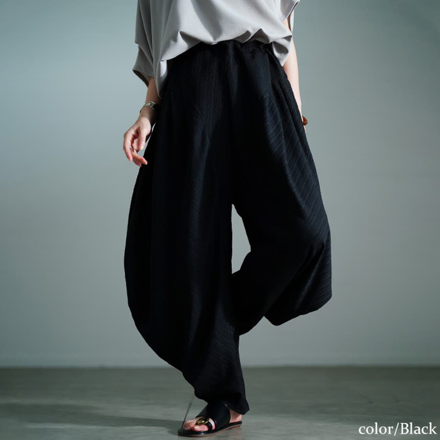 ボリューム感たっぷりのシルエットで存在感引き立つサーカスパンツは、スタイリングに取り入れるだけで遊び心を感じさせる大人のモードスタイルが完成。ストライプ状の楊柳感のあるテクスチャーが、こなれる立体感を加速させます。