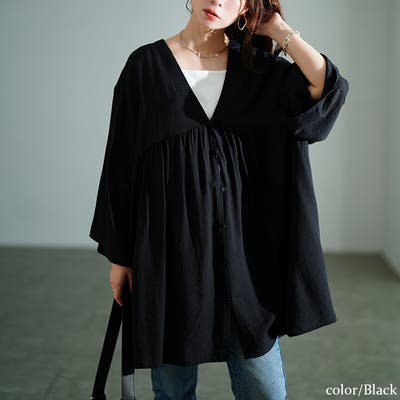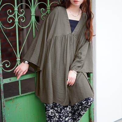 柔らかな落ち感のあるシボ感のある生地と、たっぷりのギャザーが織りなす優雅なドレープが、大人の女性にふさわしい上品な印象を与えます。フロントのボタンは開閉可能なので、羽織りとしても活躍し、コーデの幅を広げます。