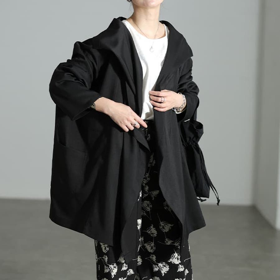 ゆったりとしたシルエットで体を包み込む、マント風デザインのルーズジャケット。