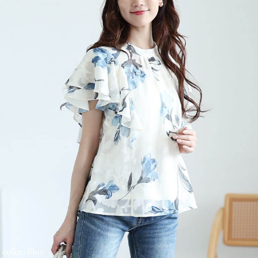 花柄ジャガードフリルブラウスの登場です♪淡色花柄のシーズンムード高まるシアー素材が涼し気な印象を醸し出します◎