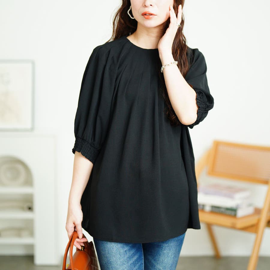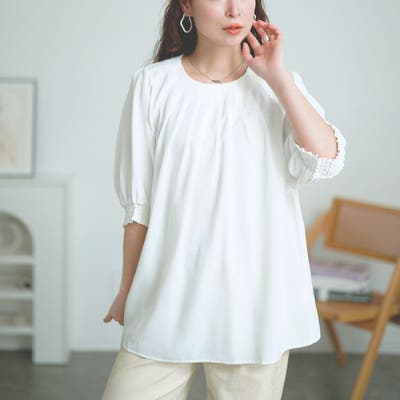 ラウンドネックとネックラインからのタックがふんわりとした立体感をプラス。