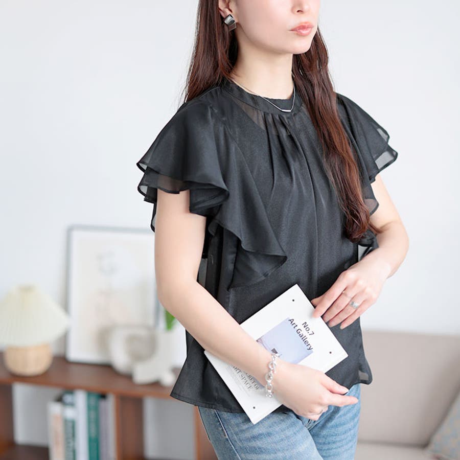 ダブルフリルの袖が甘いデザインをプラスし、二の腕を可愛くカバー。