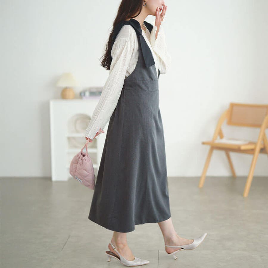 肩紐のリボンで装いに甘さをプラスし、お顔近くに大きなリボンがあることで視線をそちらに誘導し小顔効果抜群◎