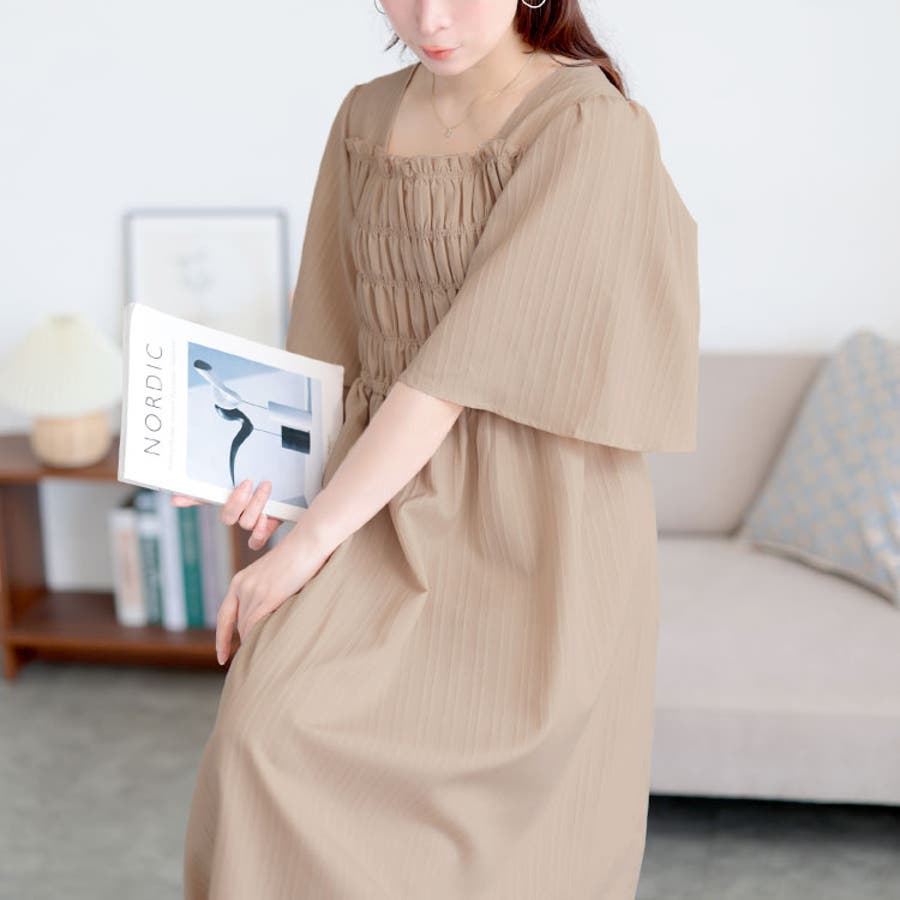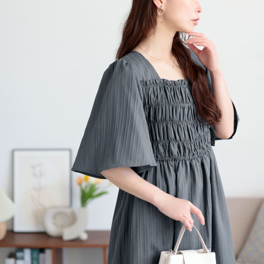 ほんのりストライプ柄のシャーリングワンピースです。