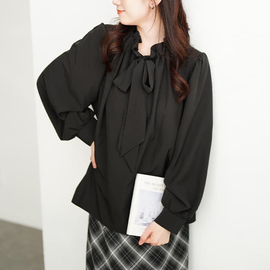 首元のリボンタイがポイントの、フェミニンムードたっぷりなブラウス。