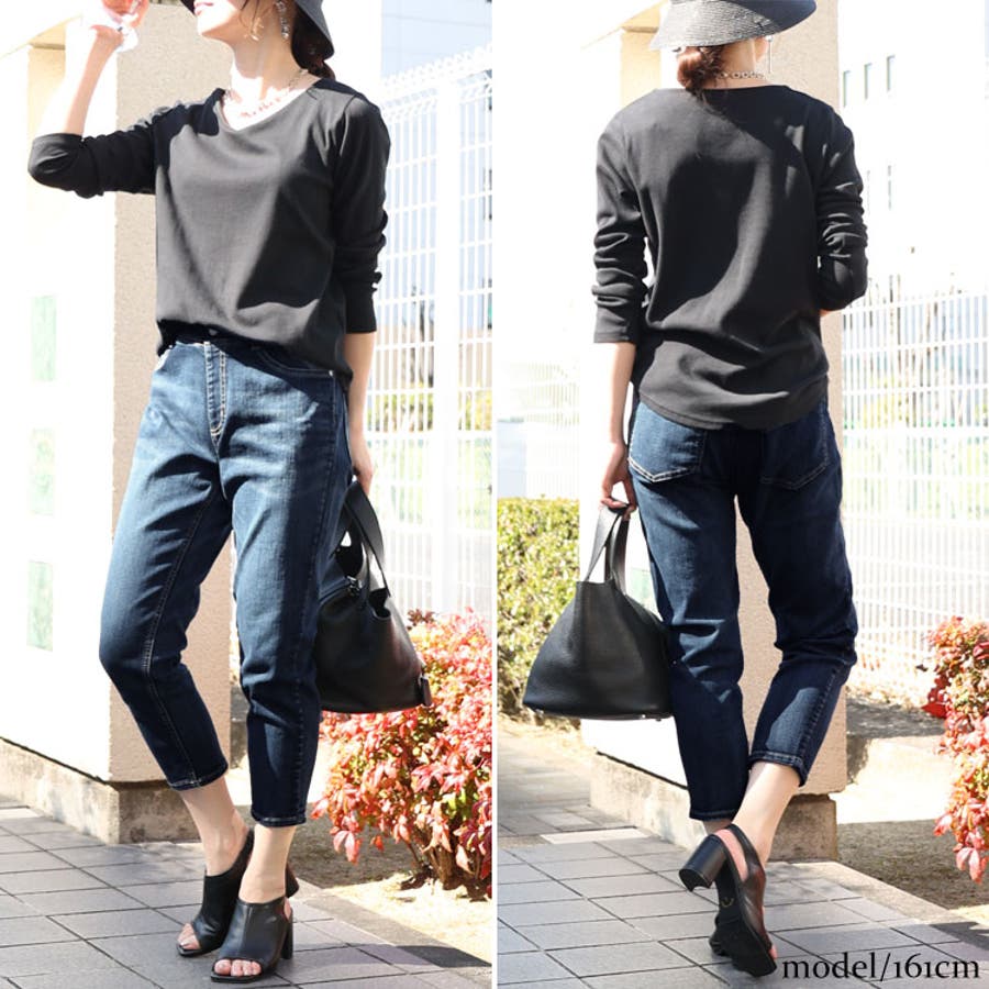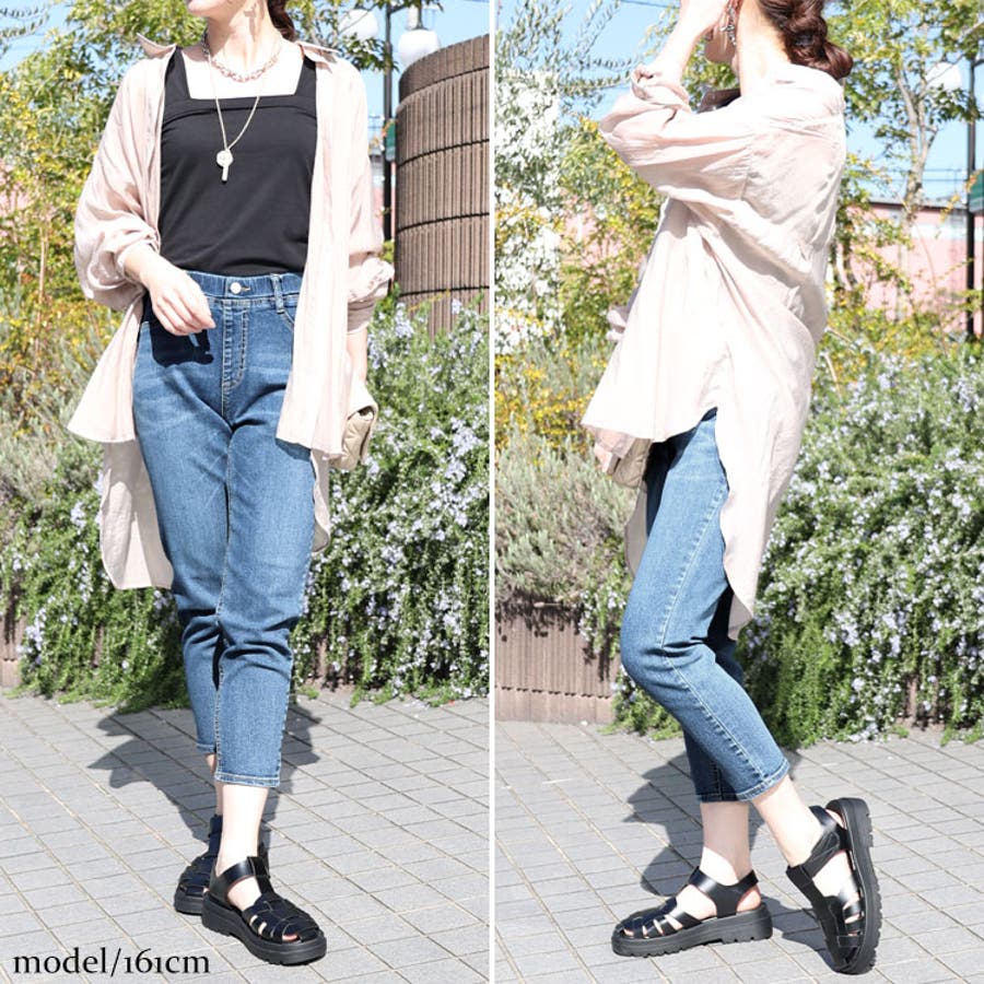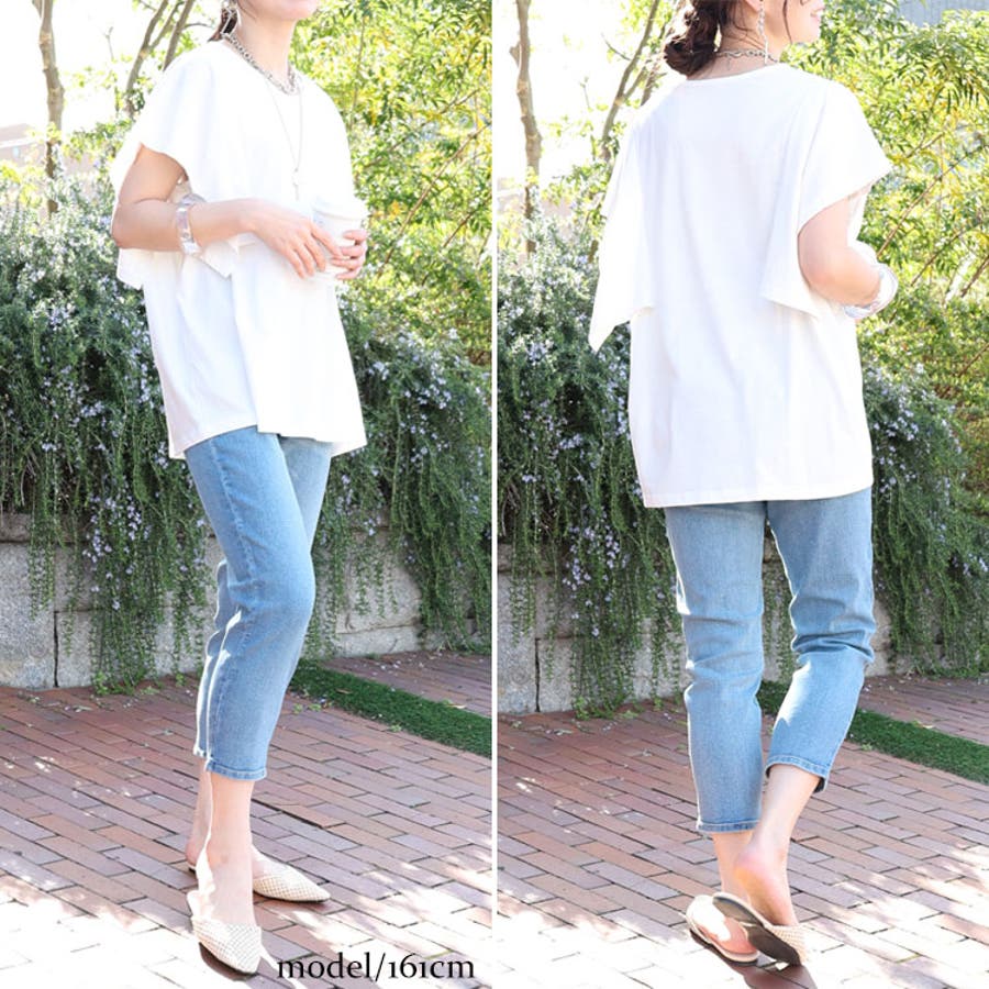 少し短めの丈で足首が見えるので着やせ効果も期待できます。