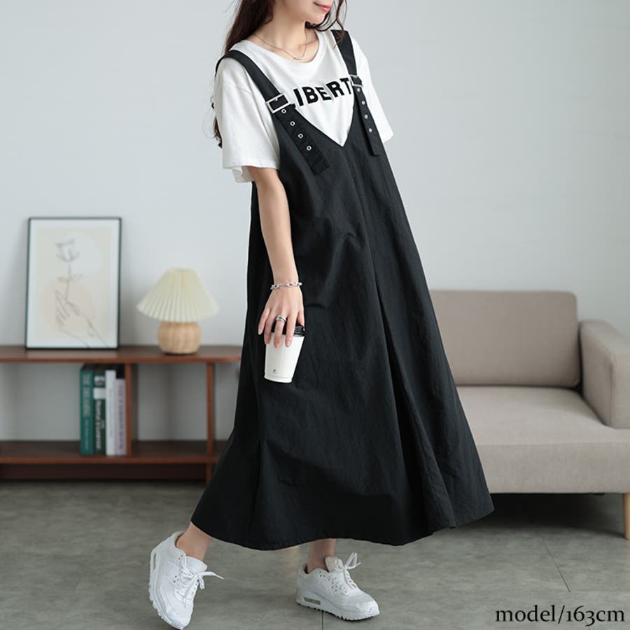 ラフに洒落る、大人の垢抜けカジュアルスタイル。シックなブラックカラーが世代を選ばず、大人っぽさを演出。肩ベルトが程よくスパイシーさをプラスし、5段階調節が可能だからお好みの着丈で着用できます。一年中楽しめるワンピースだから、季節ごとのお気に入りスタイリングを見つけてみて。