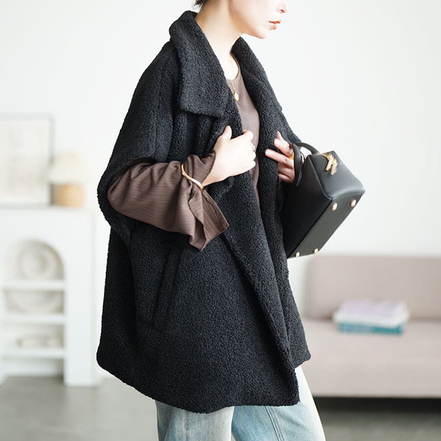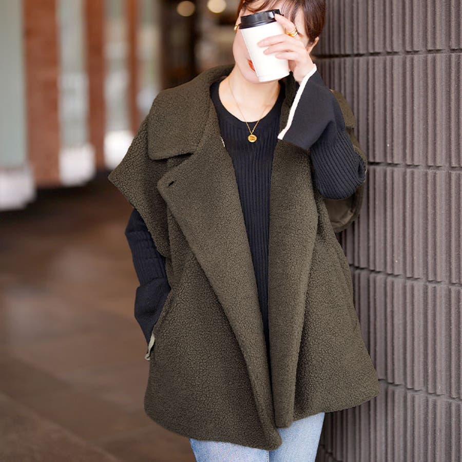 ボア素材のあたたかみと、ゆるっと抜け感のあるシルエットが大人のこなれスタイルを演出。