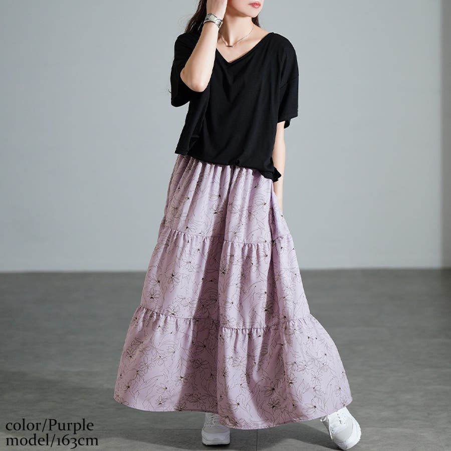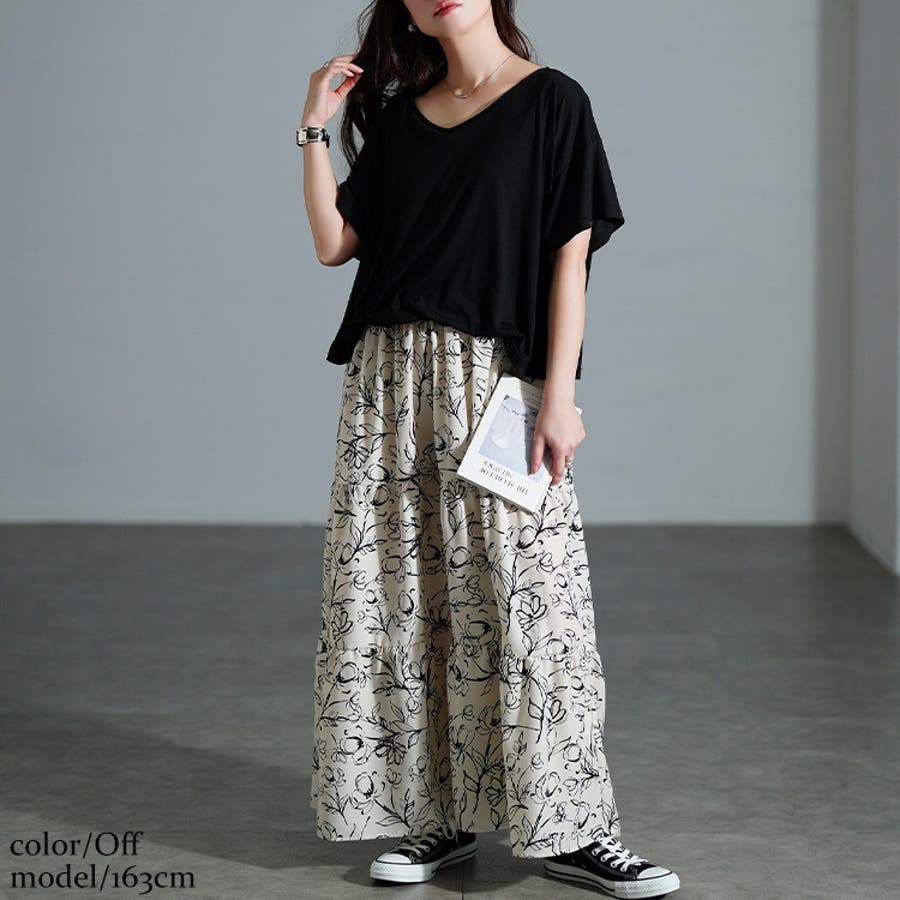 トップ部分はゆったりとしたサイジングでボディラインを拾わず、安心の5分袖で二の腕まわりもしっかりカバー。高めの位置に切り替えが配されることで脚長効果にも。フロントはタックイン風のデザインですっきり見え。落ち感のあるティアードスカートが上品に下半身を包み込みます。