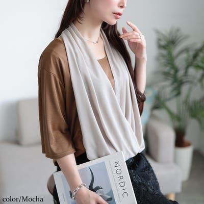 立体感のあるストールが華奢見え効果を発揮し、ゆったりとした着心地でストレスフリー。ストールはカットソーと一体型で襟足部分のボタンでズレを防止し、首肉をカバーします。スリット入りのスリーブですっきり見えし、ボトムに合わせやすい丈感でコーデしやすいのも嬉しい♪