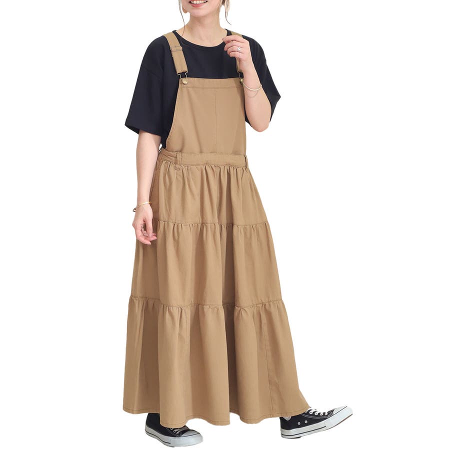 トレンドのティアードデザインがポイントのサロペットスカート。