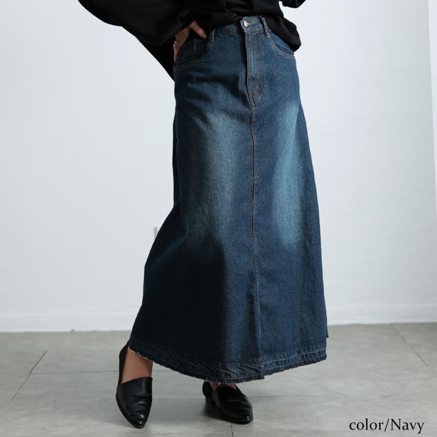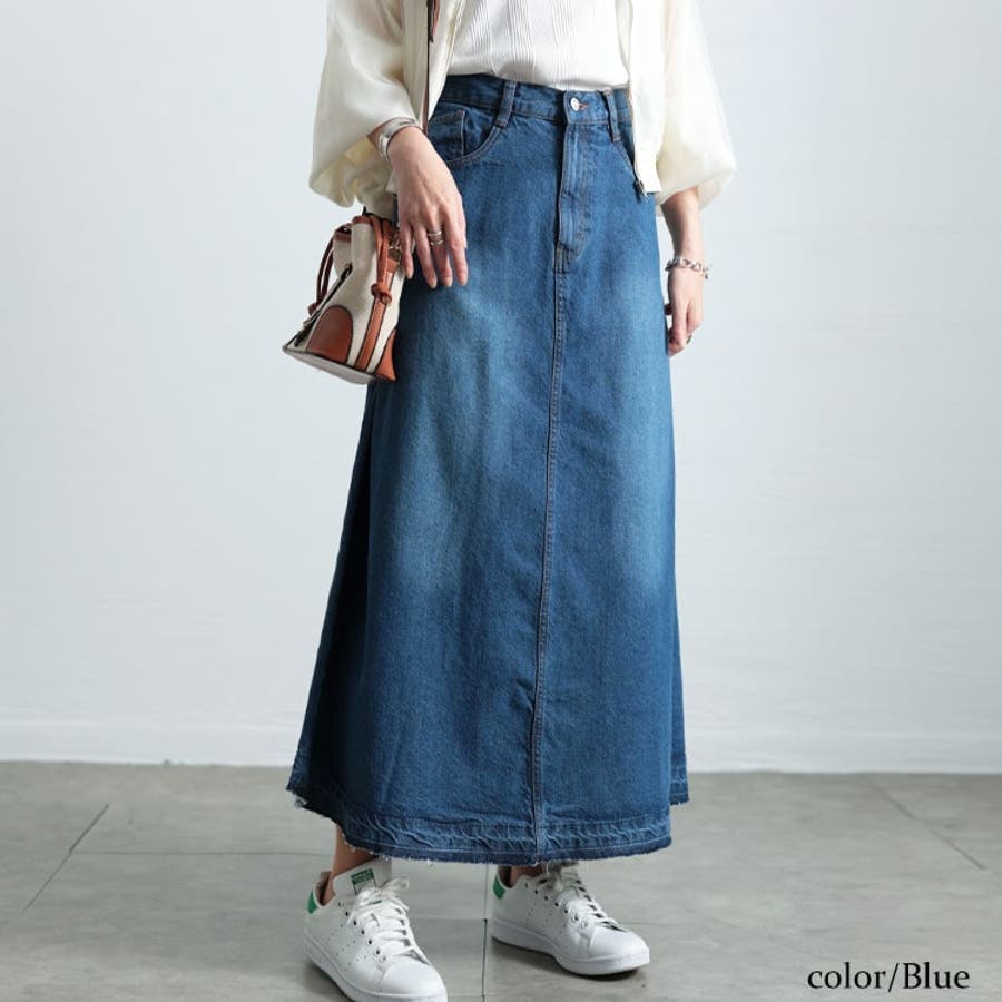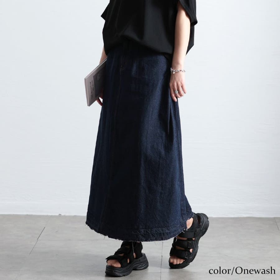 スッキリ&着回しやすい、サイドタックデニムロングスカート。