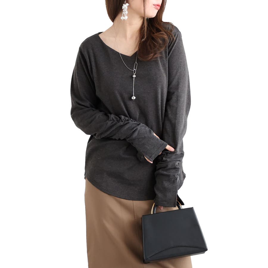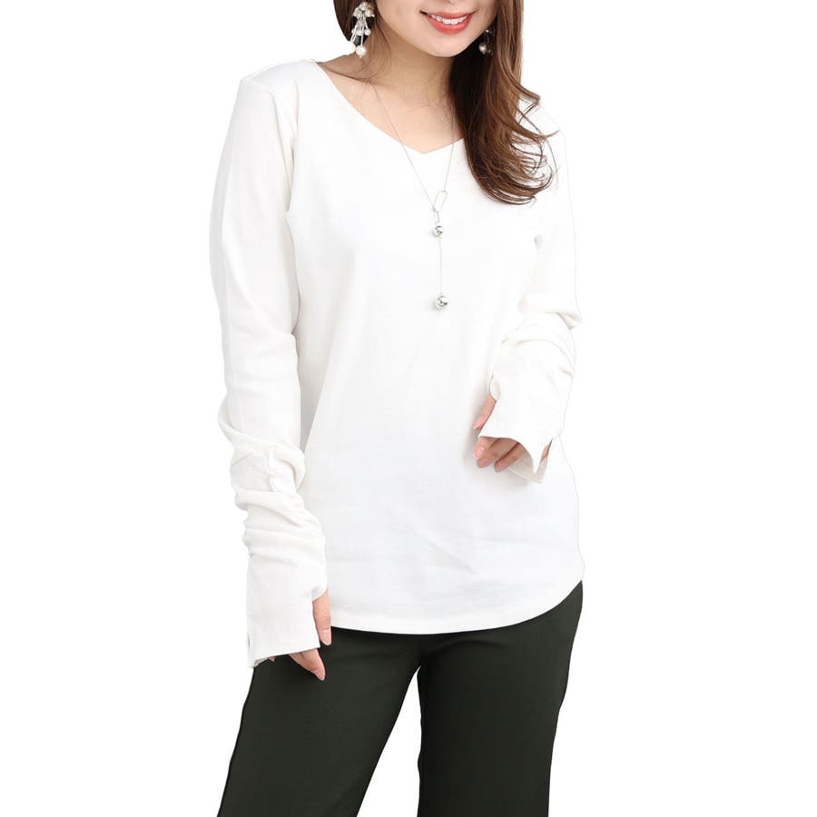 首元はVネックで顔回りすっきりと程よ良いフィット感で着心地も抜群。