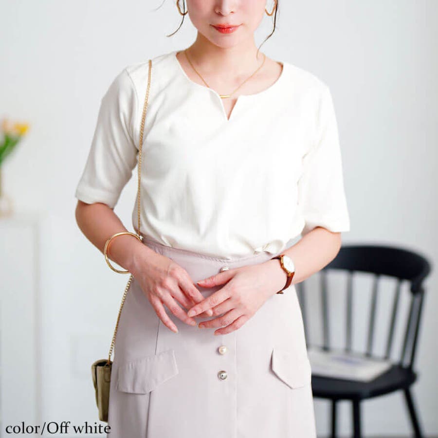 お顔まわりをスッキリ見せるキーネックでこっそり小顔効果もプラスしてくれる優秀な一着☆
