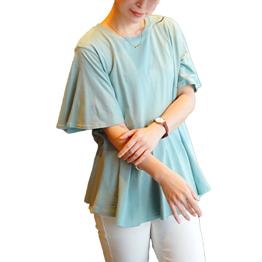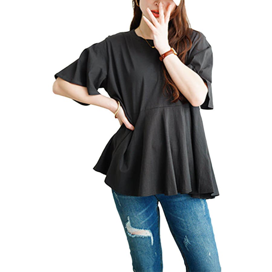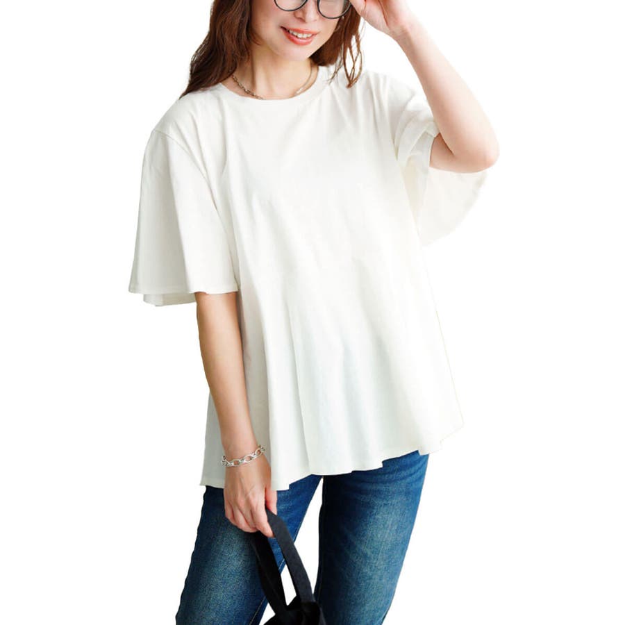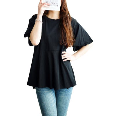 ぽっこりお腹を可憐にカバーするフレアスリーブペプラムコットンカットソー。