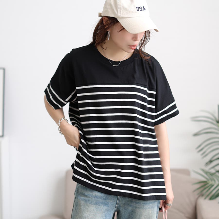 マリンムード漂うボーダー柄は、夏の着こなしにピッタリなアイテム。無地との切り替えでメリハリをつくり、世代を問わない着こなしやすさも嬉しいポイント。リラクシーなシルエットが今っぽさ漂い、使い勝手の良いモノトーンでコーデに取り入れやすい一枚。