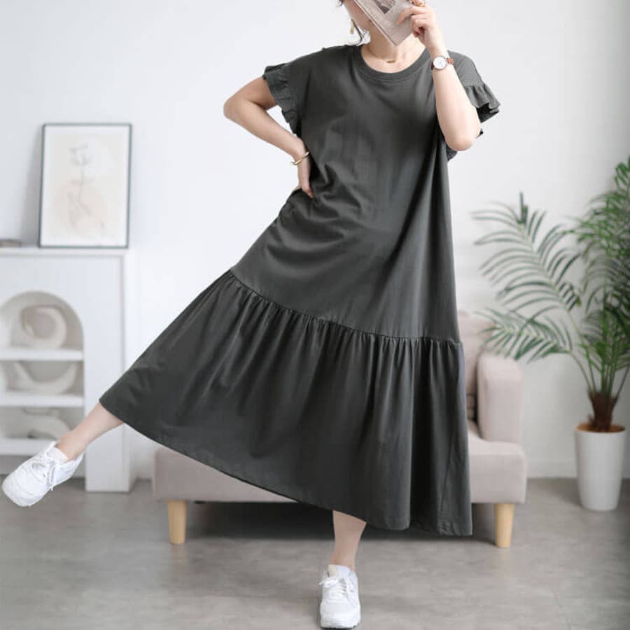 フリルフレンチスリーブコットンワンピース