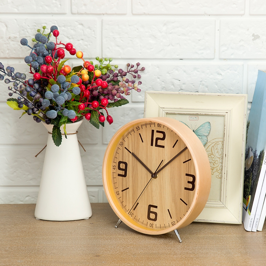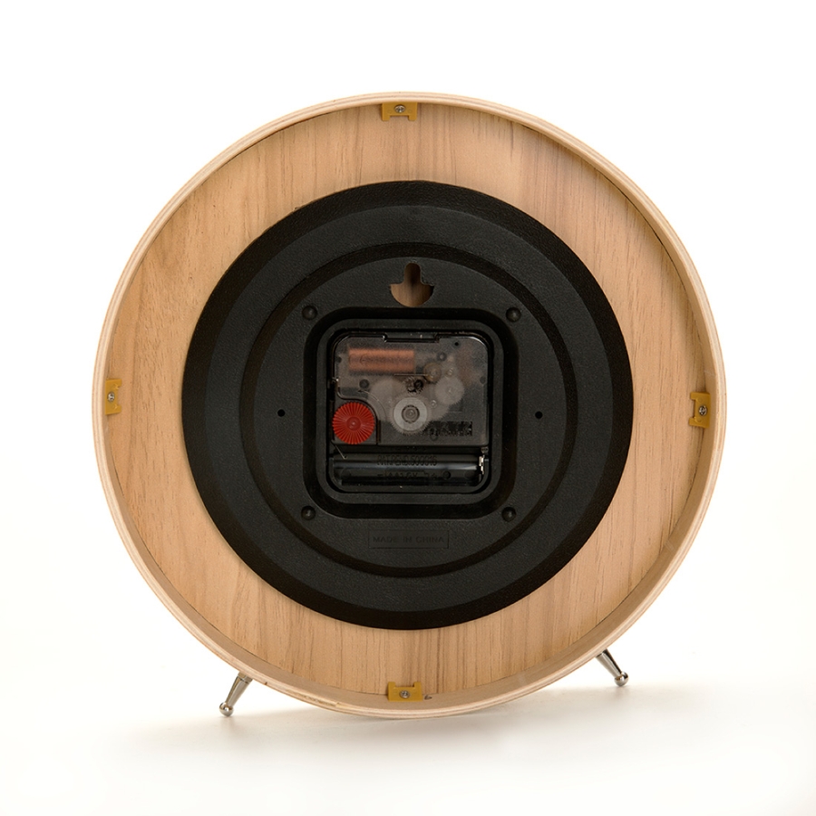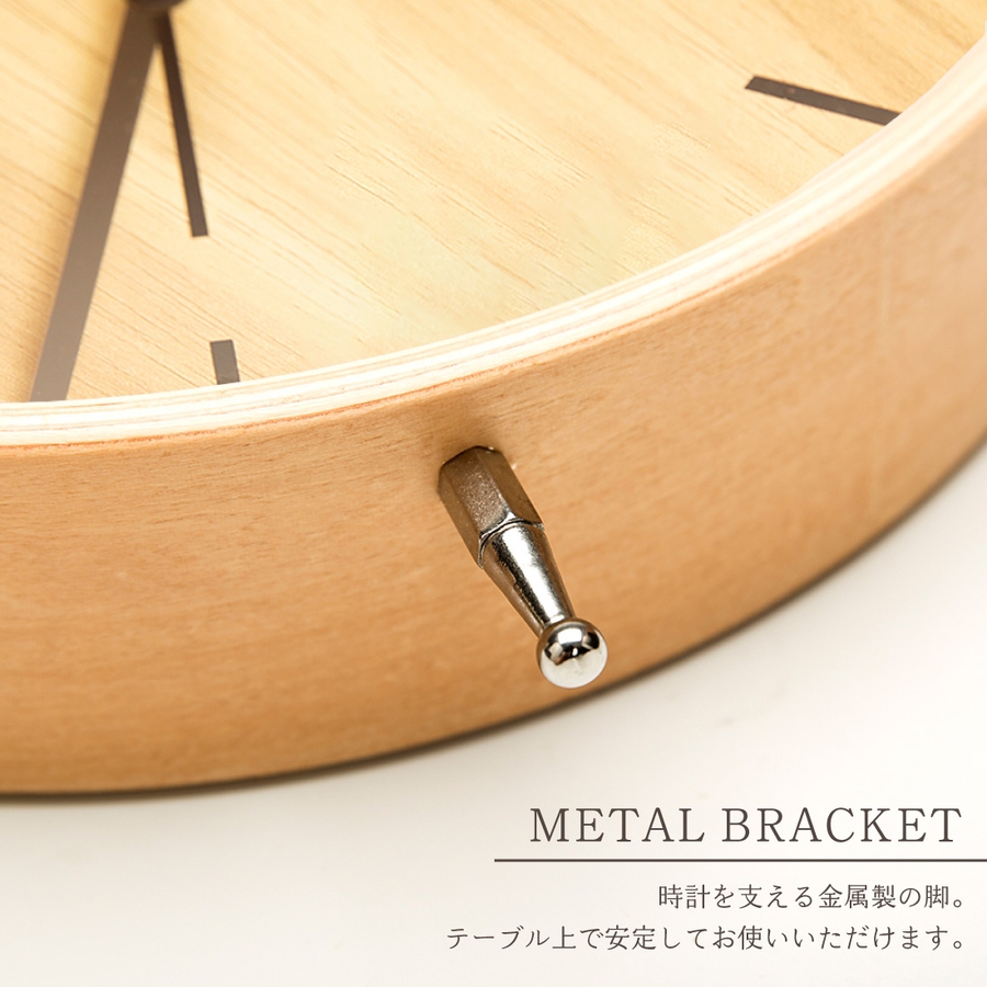 時計を支える金属製の脚がついており、自立するのでテーブル上で安心してお使い頂けます。