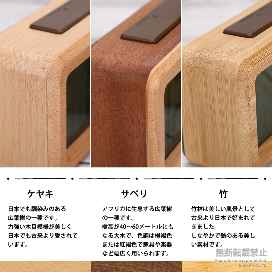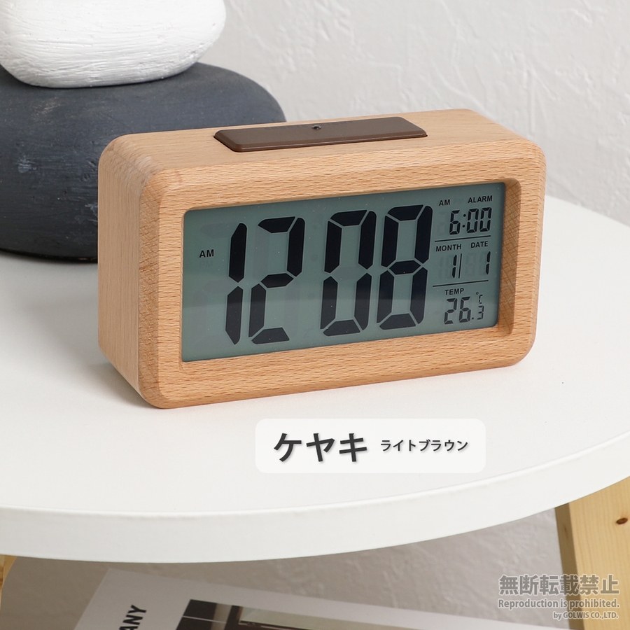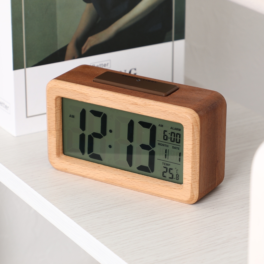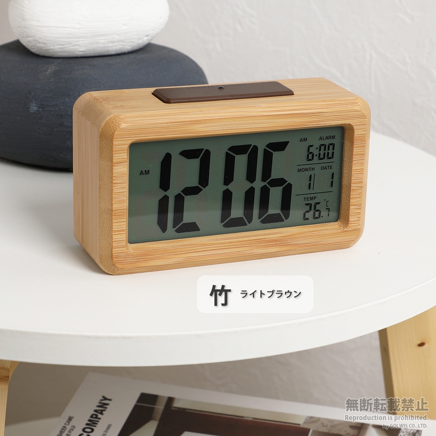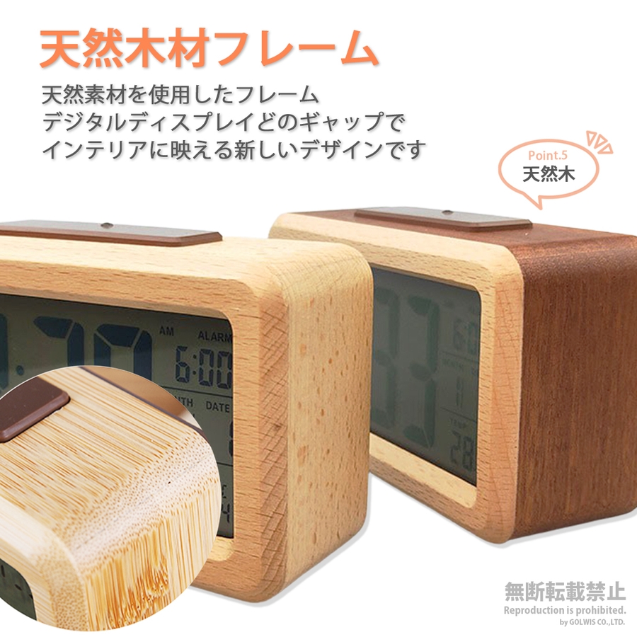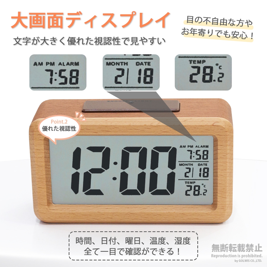 大画面液晶と木製フレームが特徴のデジタル目覚まし時計です