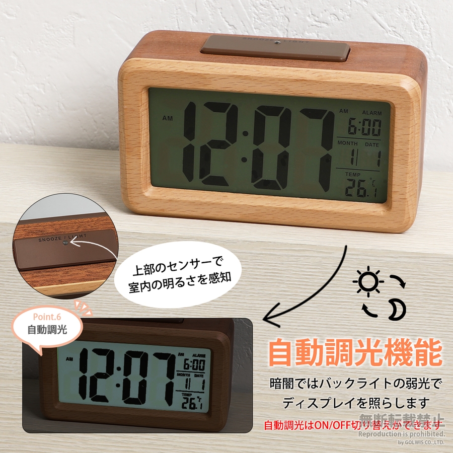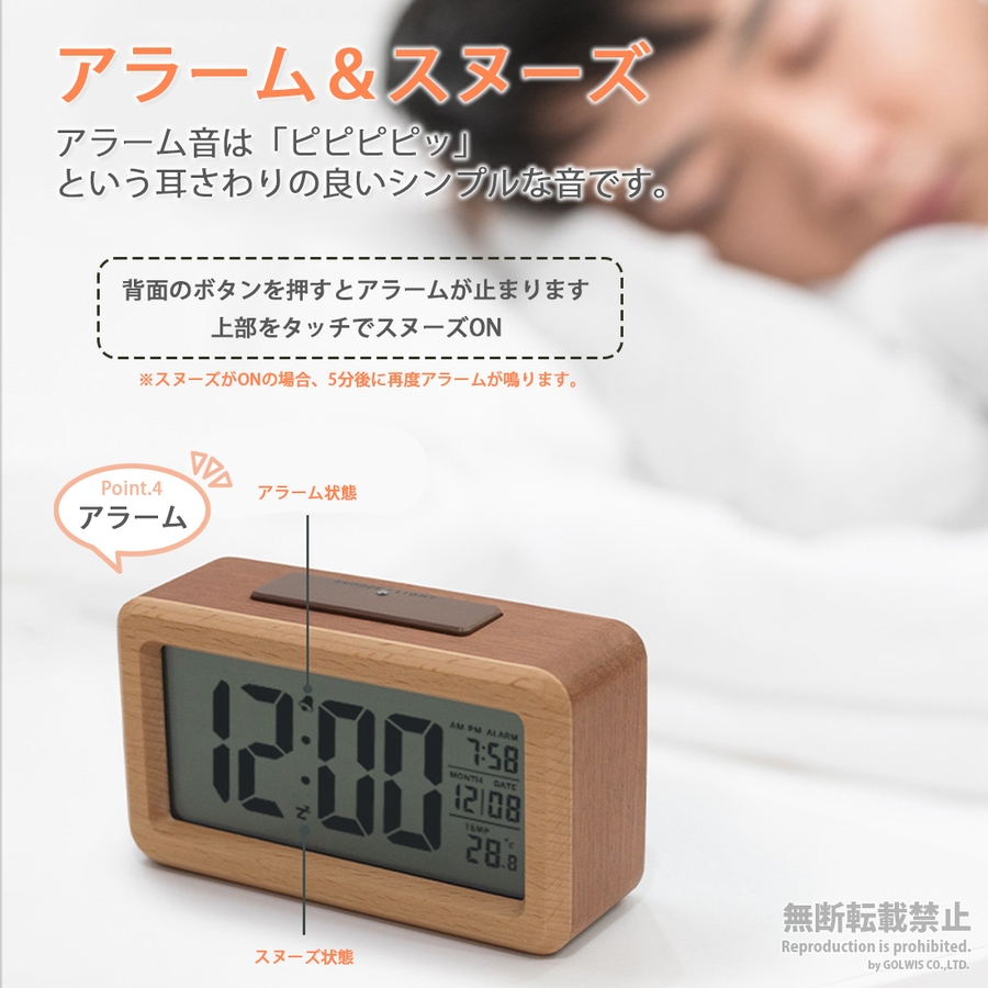 機能:時間表示、日付表示、温度表示、アラーム、スヌーズ、表示切替、自動調光