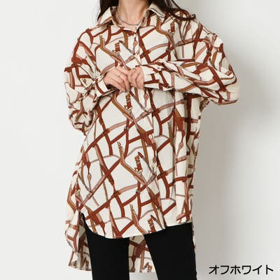 印象的な総柄でレトロ感をプラスしたロングシャツの登場★1枚着るだけで大人な雰囲気へと導くチェーンベルト柄で脱ベーシック♪甘くなり過ぎない色味ととろみ感がある柔らかなルーズシルエットで気になる体型もしっかりカバーしてくれて大人女子には嬉しいデザイン◎一見派手にみえる総柄ですが、着用すると1枚で存在感があり上品おしゃれにキマる推しアイテムです☆