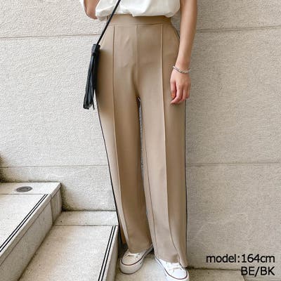 大胆に入ったサイドラインがポイントのストレートワイドパンツが登場★ワイドシルエットで脚のラインを拾いすぎないのもポイント♪サイドラインが入ることで縦ラインを強調し、スタイルアップ効果が期待できる◎カジュアルな素材なので、トップスは女性らしいアイテムで合わせていただくのがオススメです☆