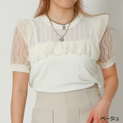 ふわっとした袖のレースにバルーン感が可愛いトップスが登場★ニットにシアー感を出すことで涼やかな印象に♪ワントーンでシンプルに見えながらもフリルやレースで細部にまでこだわったデザイン◎ワイドシルエットやフレアスカートなどボリューム感のあるボトムと合わせるとスタイリング映え間違いなしです☆