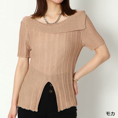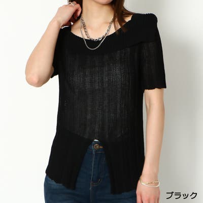 アシンメトリーなデコルテラインがお洒落なニットが登場★透かし編みでエアリーな印象に♪すっきりとしたシルエットで華奢見えを演出し気になる二の腕もカバー◎裾のスリットが表情豊かにしてくれるので、これ1枚でシンプルなスタイルもサマになる、優秀トップスです☆