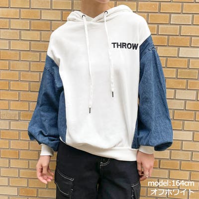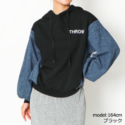 異素材コンビデザインの印象的なパーカー。ケミカルデニムの切替とインパクトのあるロゴデザインでスタイリッシュな一着。身幅にゆとりを持たせてデザインされたトレンドライクなシルエットは合わせやすくて着回し力抜群◎オーバーシルエットでゆったり着ることができ、華奢な印象に見せてくれる嬉しい効果も期待大です。