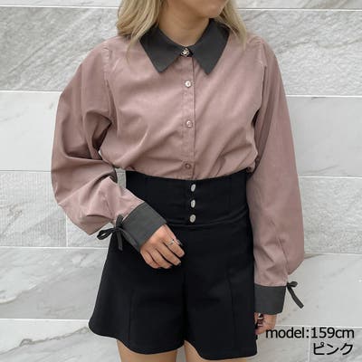 衿と袖口の配色使いがお洒落なシャツブラウスが登場★第一ボタンに配したアクセサリー感覚の大きめなスワロフスキーボタンがポイント♪両袖口にリボンが付いたフェミニンな雰囲気を演出◎タックインもアウトもバランスよく決まる、すっきりめのシルエットなのでスカート合わせのフェミニンにも、デニムと合わせたカジュアルにもオススメのアイテムです☆