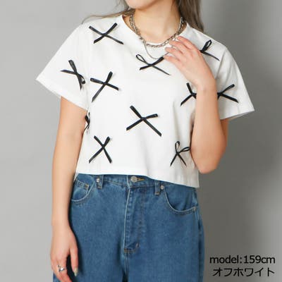 リボンデザインで他の子と差を付けられちゃうTシャツ。コンパクトなシルエットのスタンダートなTシャツにリボンデザインでインパクトのある一枚。アクセントのあるトップスなので、シンプルなボトムスとのコーデがおすすめ。プリーツスカートやミニスカート合わせでガーリースタイルに、デニムやワイドパンツと合わせて大人カジュアルコーデにもピッタリです。