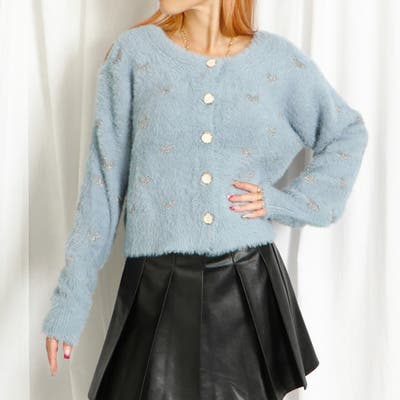 キラッと光るハート柄と上品なボタンがアクセント!前後2WAYフェザーカーディガン。落ち感のある、しっとりとした艶やかな素材。ショート丈なので、ワイドシルエットのボトムスと好相性◎韓国っぽくプリーツミニなどミニボトムを合わせても可愛いコーデに仕上がります♪