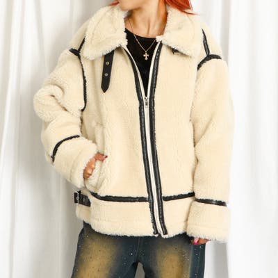 オトナカジュアルコーデにトレンドをプラスしてくれるボアフライトジャケット。フェイクレザーのパイピングがポイントになった、今季注目のアイテム。オーバーサイズのデザインは、ニットワンピースやIラインのスカート、センタープレスのパンツなど、スッキリとしたボトムスやワンピースと好相性◎