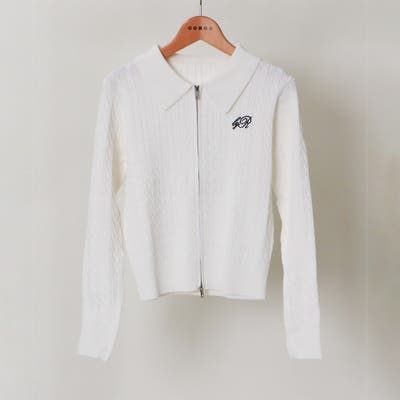 クラシカルなケーブル編みが、上品で落ち着いた印象を与えるカーディガン。襟付きデザインで、女性らしさとカジュアル感を両立。Wジップ仕様だから、ジップを開けてラフに着こなしてもOK!