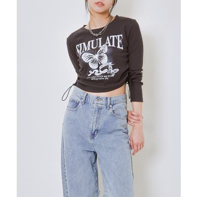 ギャザーを施したテレコ素材のトップスに、バタフライプリントがアクセントとして加わり、シンプルながらも華やかな印象に仕上げました。カジュアルにもフェミニンにも着こなせる一着です◎