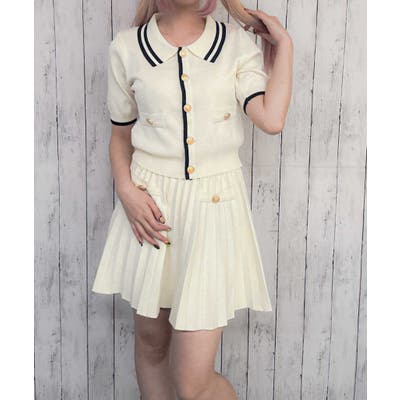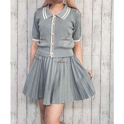 《2点セットで着映え》レディース 金ボタンニット×プリーツスカートSETUP 春…