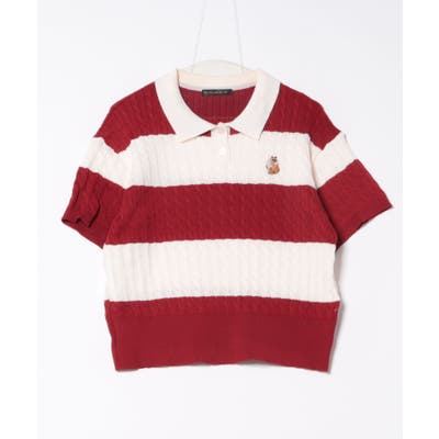 《ワンポイント刺繍×太ボーダー》レディース ケーブル編み 半袖ポロニット