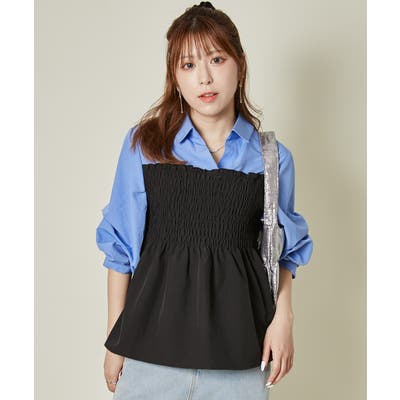 異素材を組み合わせたデザインが目を引く、ドッキングスキッパーシャツ。シャツに、シャーリング×無地切り替えの身頃を組み合わせることで、まるでビスチェをレイヤードしているような凝ったルックスを1枚で楽しめるアイテムです。こなれ感と女性らしさを両立した、大人可愛いスタイルに仕上がります。